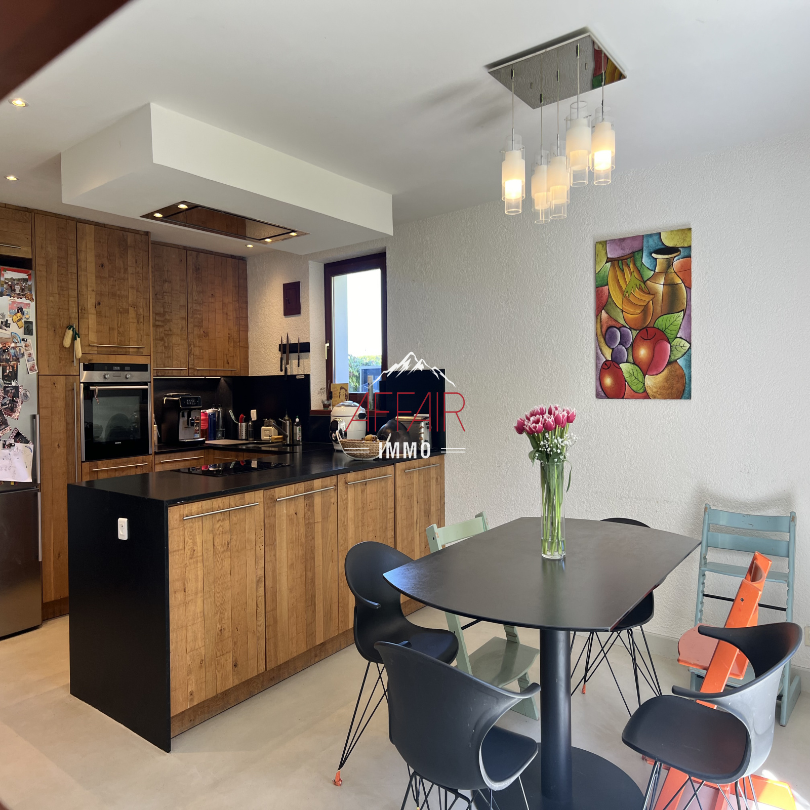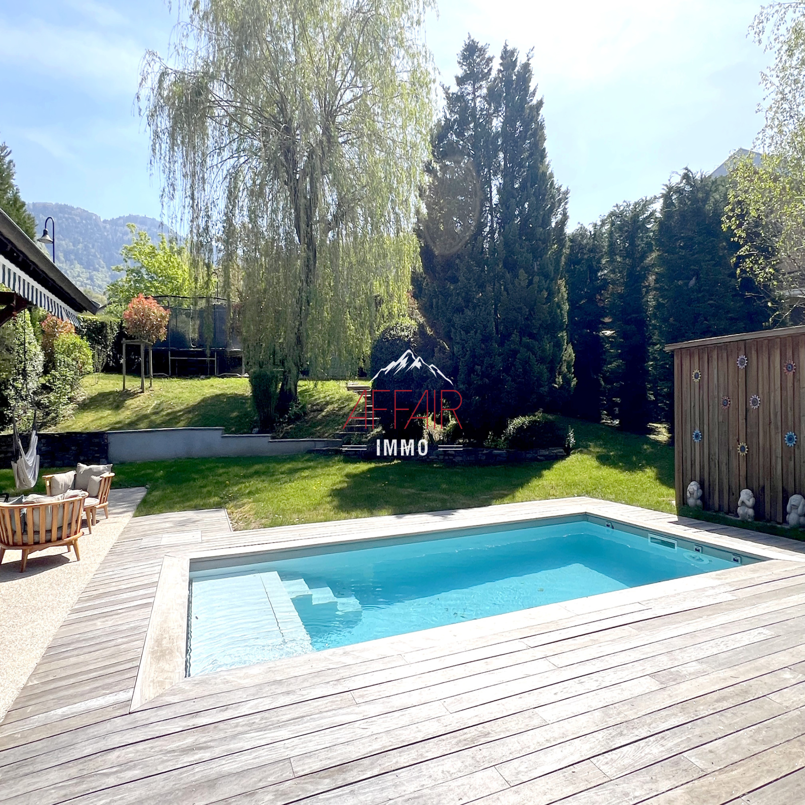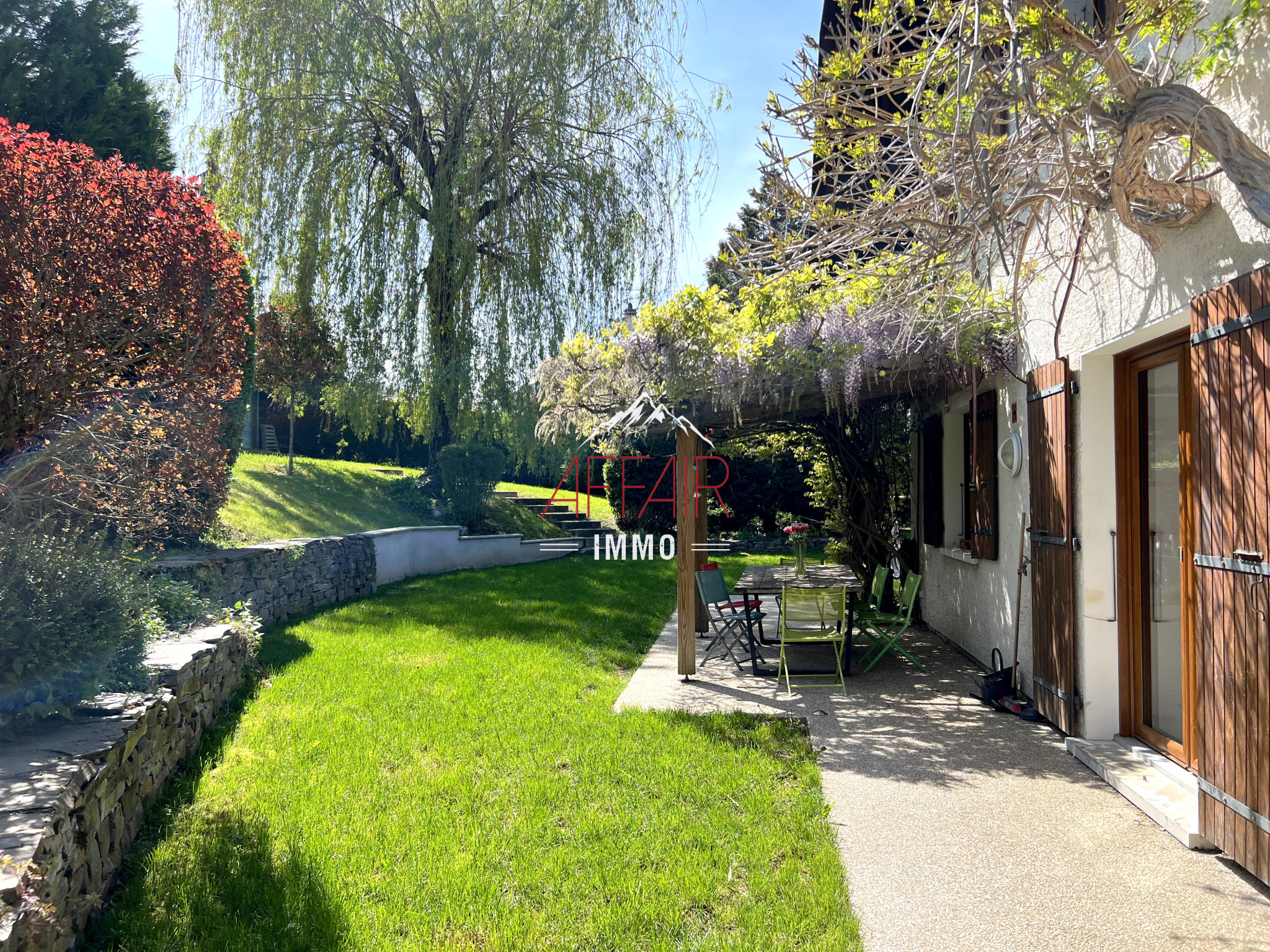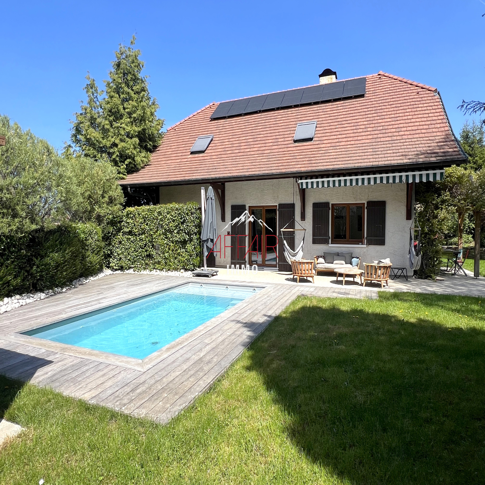 NEYDENS (74160) à 5 minutes de la Douane de Croix de Rozon, 20 minutes de Genève et de son aéroport, dans un agréable quartier résidentiel, charmante maison individuelle d'environ 160 m² implantée sur un magnifique terrain clos et arboré d'environ 1042 m². Au calme, elle offre une spacieuse et lumineuse pièce de vie avec une cheminée, une cuisine équipée avec son coin repas, le tout avec un accès aux terrasses et jardin agrémentée d'une piscine récente de dimentsion 6x3m, chauffée et sécurisée. Une suite parentale de plain pied avec placards intégrés, sa salle de bains avec WC. Un WC indépendant à l'entrée. A l'étage un espace bureau ou salle de jeux avec balcon, deux grandes chambres, une salle de douche avec WC. Un dressing. Possibilité d'aménager quatre chambres à l'étage si nécessaire. Un sous-sol aménagé avec buanderie, une cave à vin, une pièce de rangement, une pièce aménagée en chambre ou bureau, une salle de douche avec WC. Un garage avec porte motorisée et stationnements en extérieur. Chauffage au gaz, climatisation réversible, panneaux photovoltaïques, portail d'entrée motorisé.