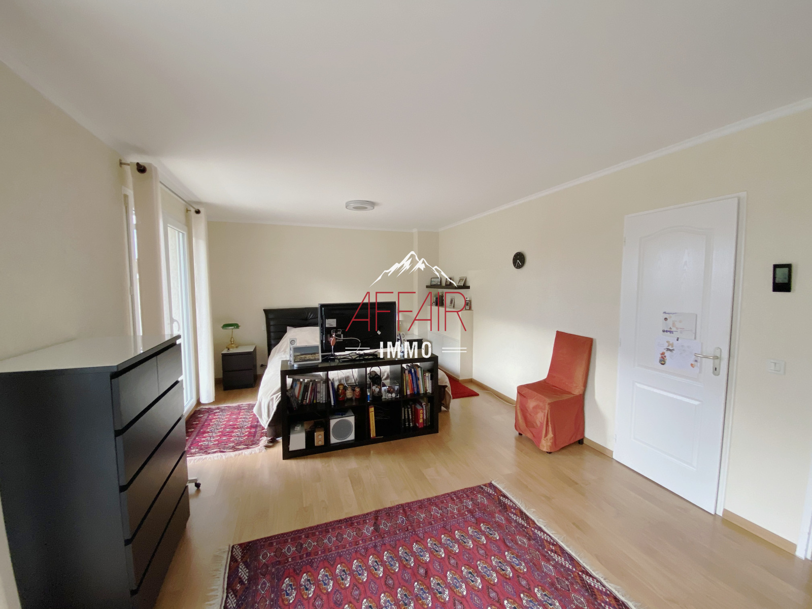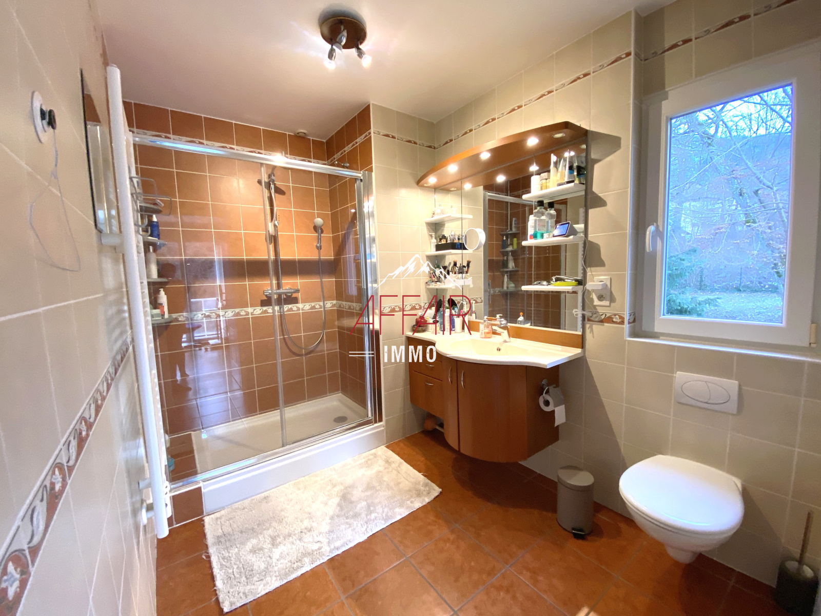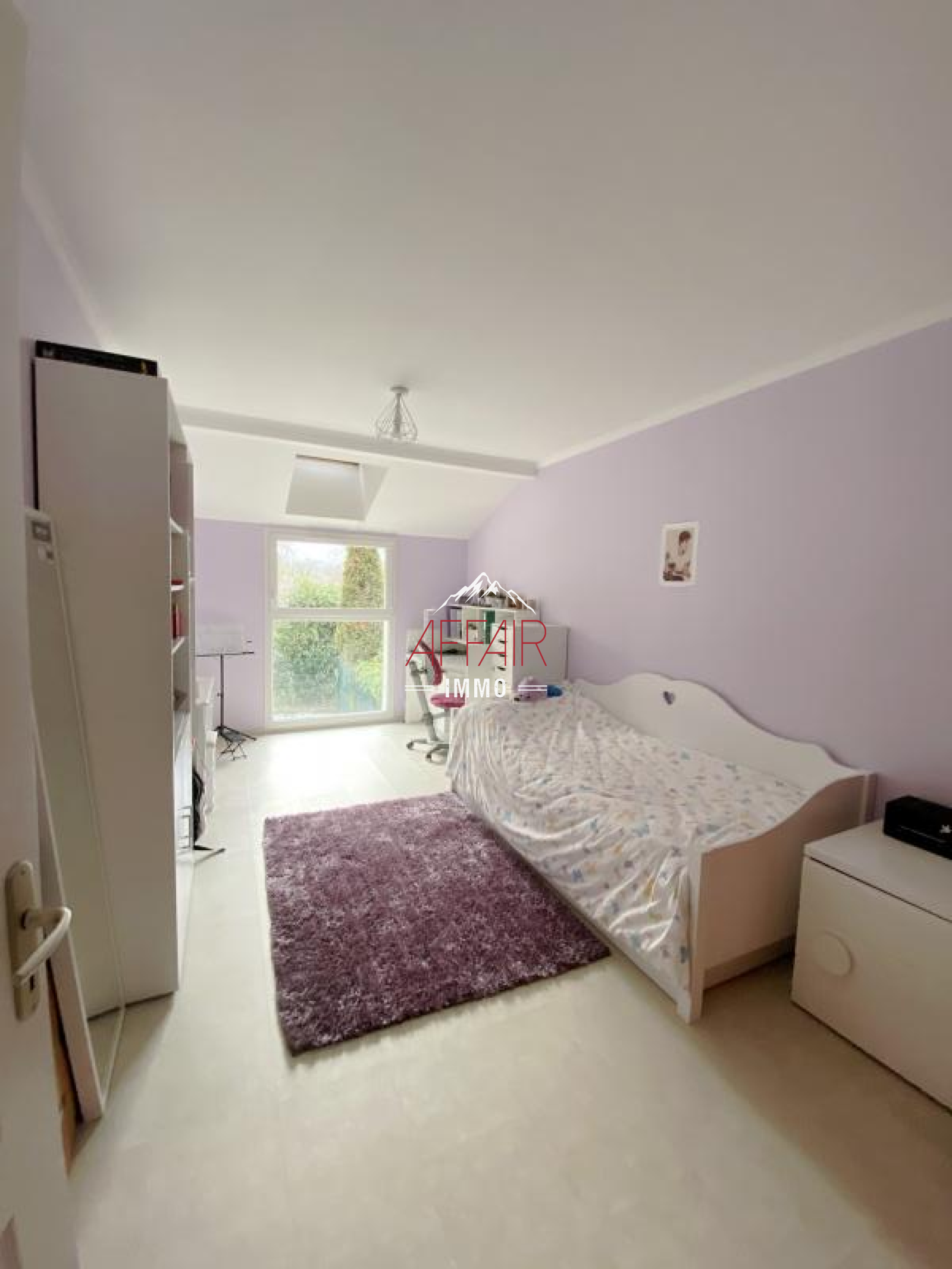 A 2 min DOUANE DE CROIX DE ROZON, au centre de Collonges s/Salève, proche toutes commodités (commerces, bus), maison mitoyenne côté garage sans vis à vis de 160 m², sur un terrain de 256 m², sur demi-niveau comprenant au rez de chaussée une cuisine ouverte sur un grand salon, un wc, au 1er demi-niveau un bureau (ou chambre), une chambre, au 2ème demi-niveau, une suite parentale de 26 m² avec une salle de douche et un wc pouvant être divisée en deux chambres, une chambre et une salle de bains avec wc. Un garage double avec local technique et cave.