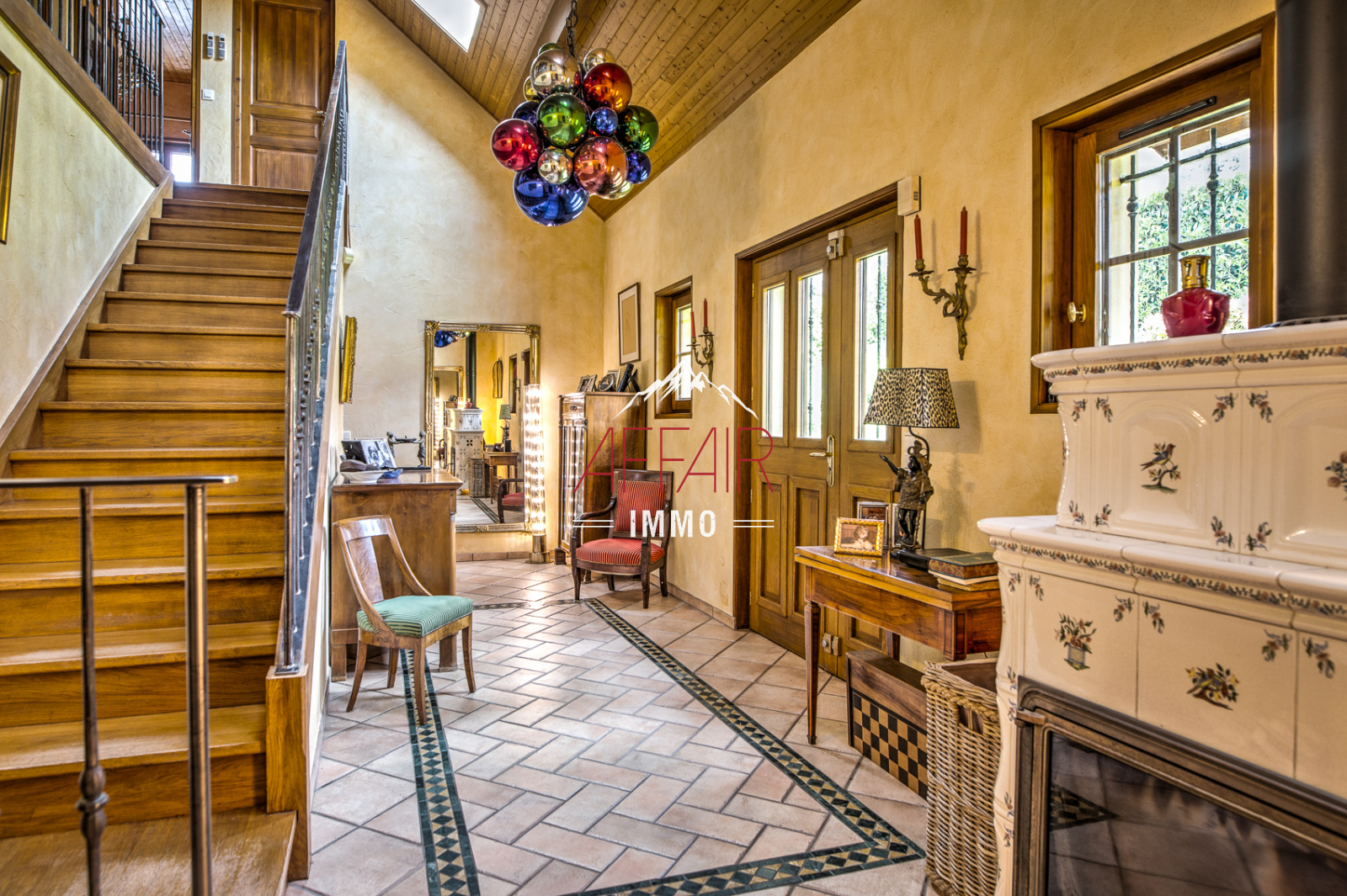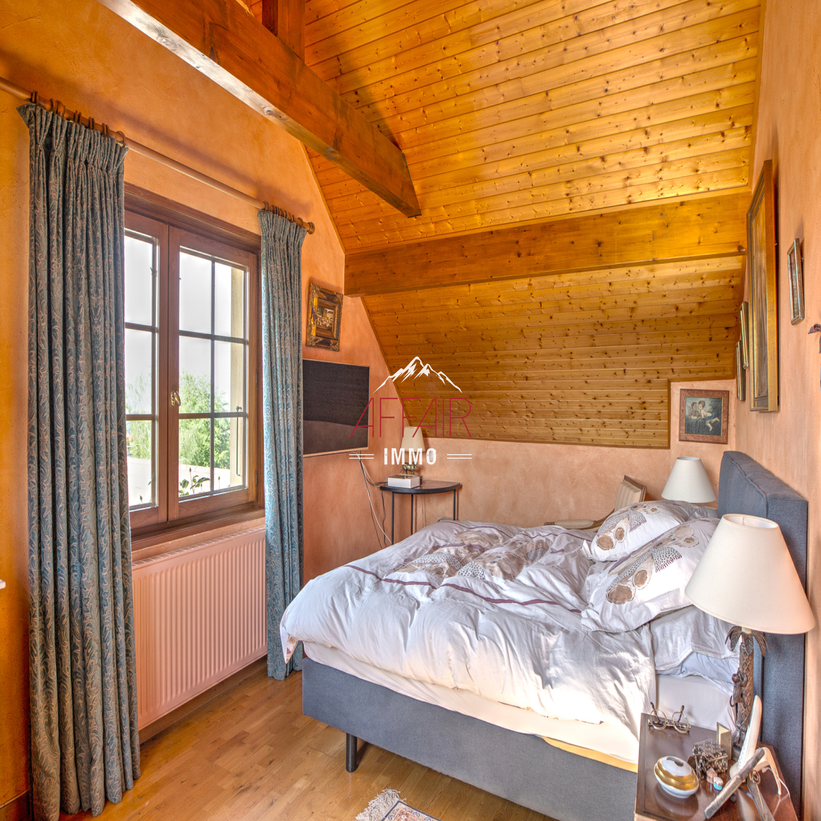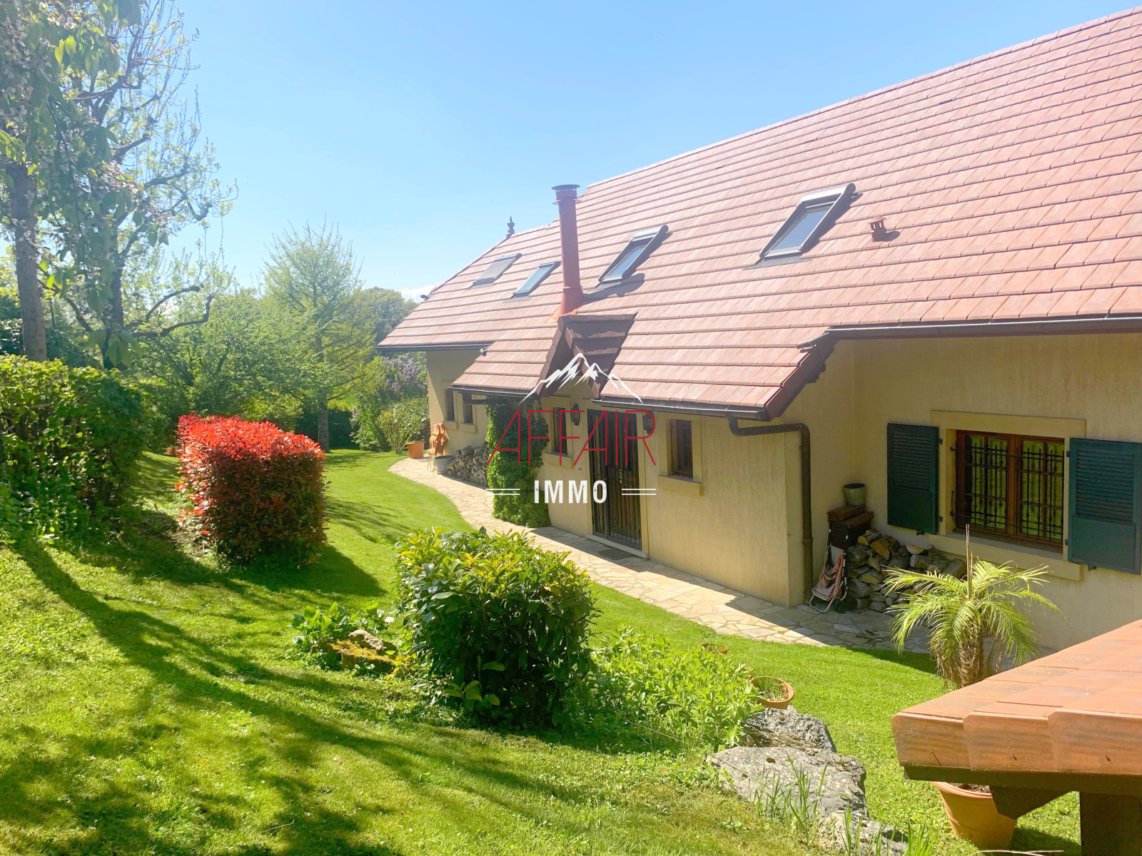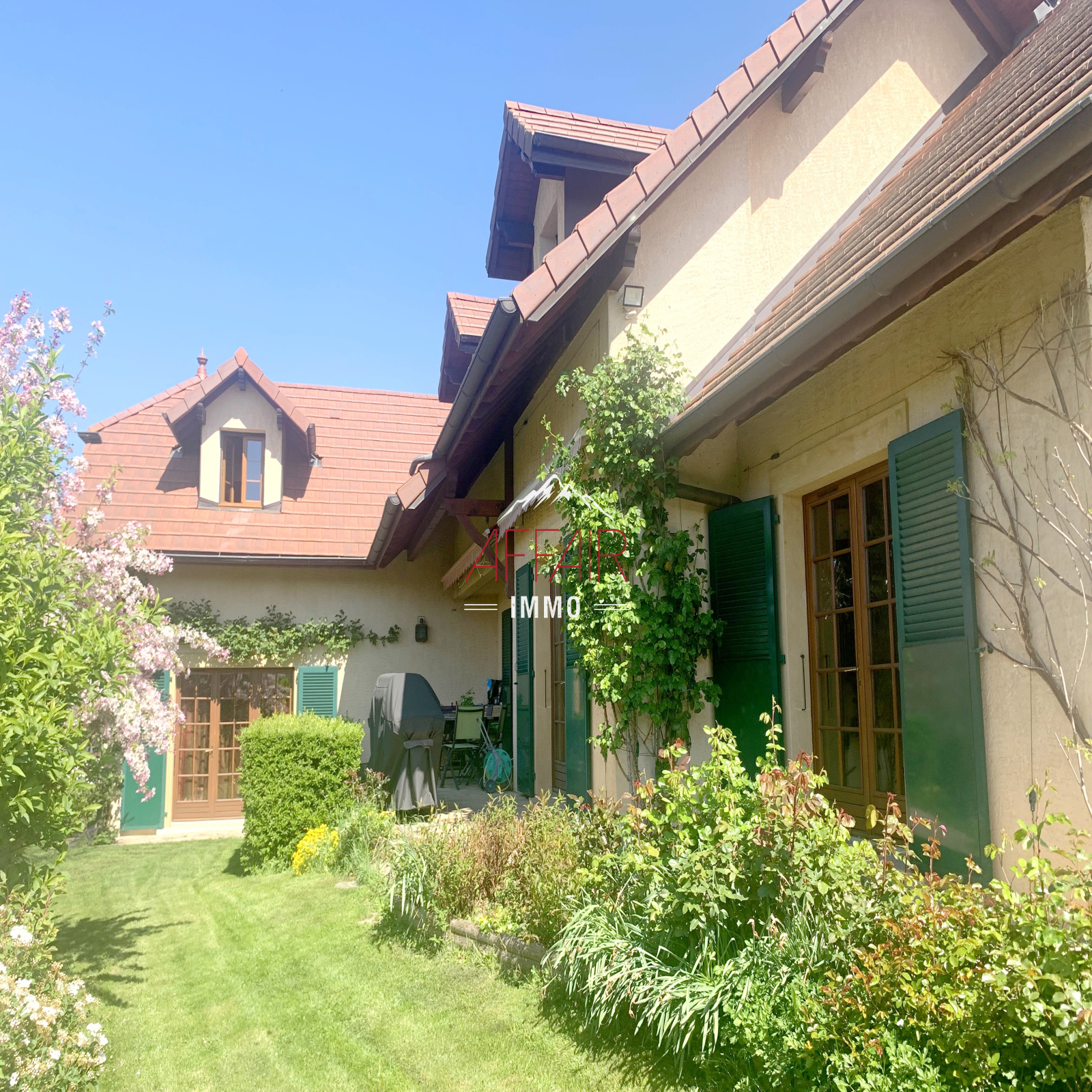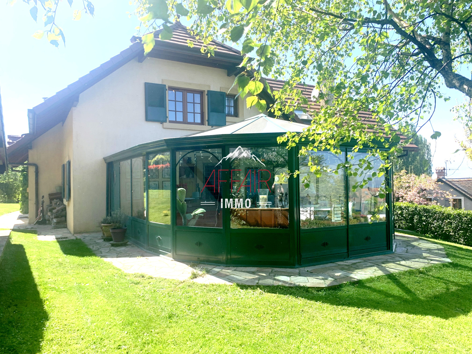 A 10 minutes de GENEVE, 15 minutes de l'aéroport - Au centre du village de Collonges-sous-Salève 74160, idéalement située à proximité des commerces, écoles et bus TPG, et à 2 minutes de la Douane de la Croix de Rozon, dans un environnement calme et privilégié offrant une vue dégagée sur le Jura, le Lac Léman et le Salève, maison individuelle de caractère et de qualité d'environ 380 m² implantée sur un terrain de 1650 m²entièrement arboré et clôturé. Elle nous offre au rez de chaussée une grande entrée avec son poêle Godin, une récente cuisine équipée ouverte sur la salle à manger, une double salle de séjour avec sa cheminée donnant accès à une spacieuse véranda chauffée baignée de lumière accueillant un jacuzzi et un hammam où vous pourrez profiter d'une agréable vue dégagée sur le Jura, le Lac Léman et le Salève. Une chambre avec mezzanine. Un wc indépendant et une buanderie. A l'étage une suite parentale avec placards, sa salle de bains avec double vasque, baignoire, douche et wc, une chambre avec sa salle de douche et wc, deux autres chambres, une salle de bains avec baignoire et douche, un wc indépendant. Nombreux rangements au sous-sol et une cave à vin. A l'extérieur, un chalet de jardin. Chauffage au gaz, au sol au rez. Terrain piscinable.