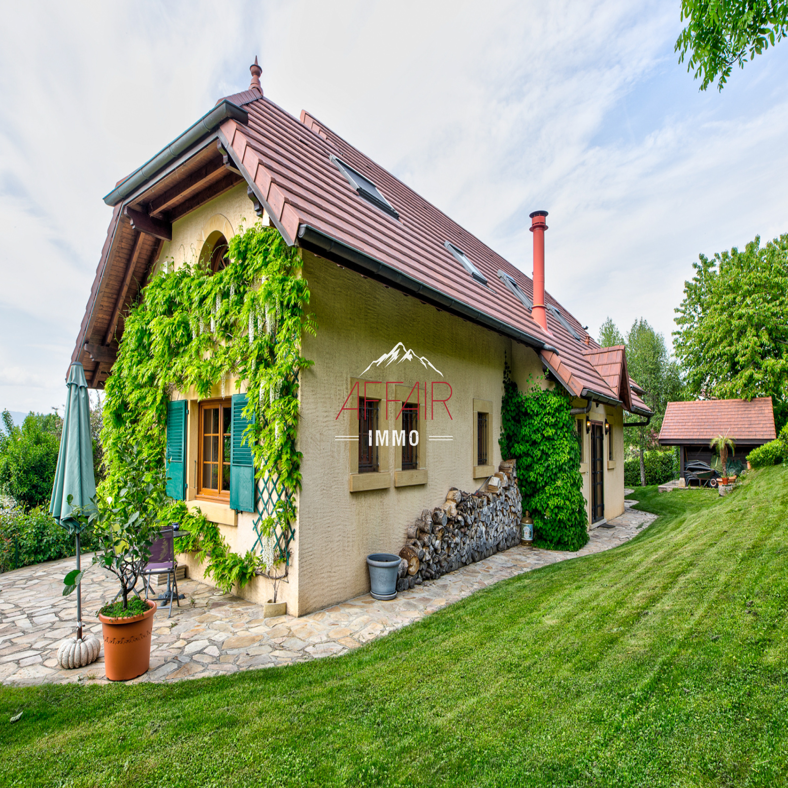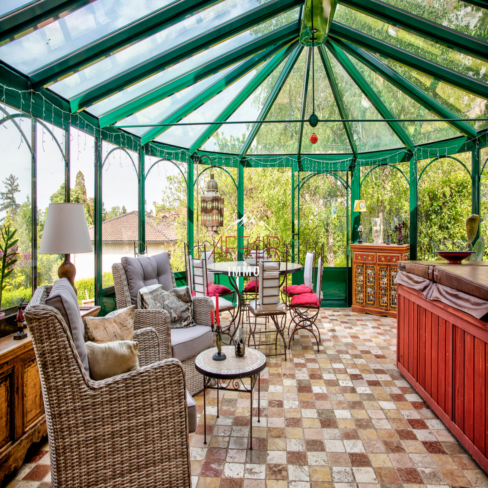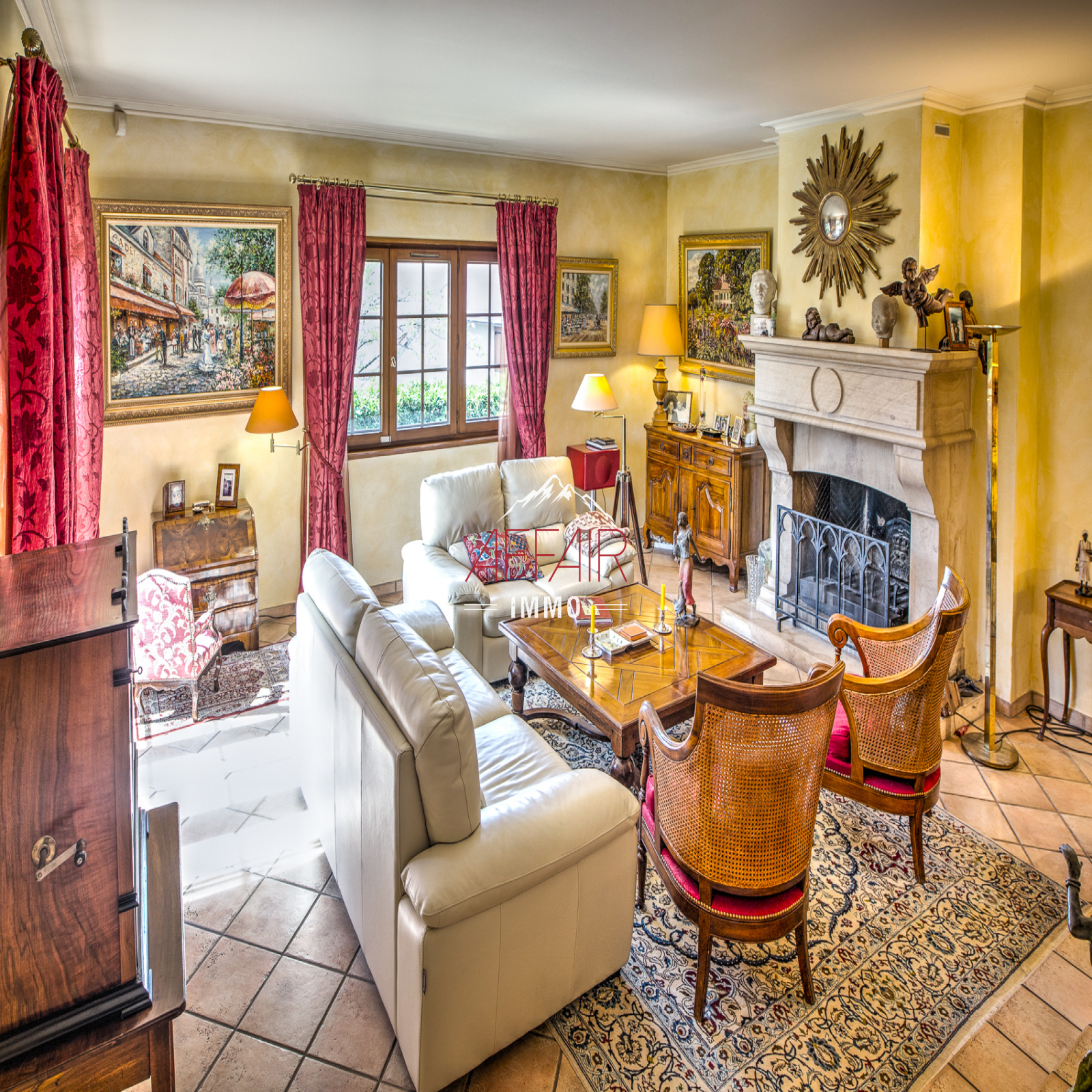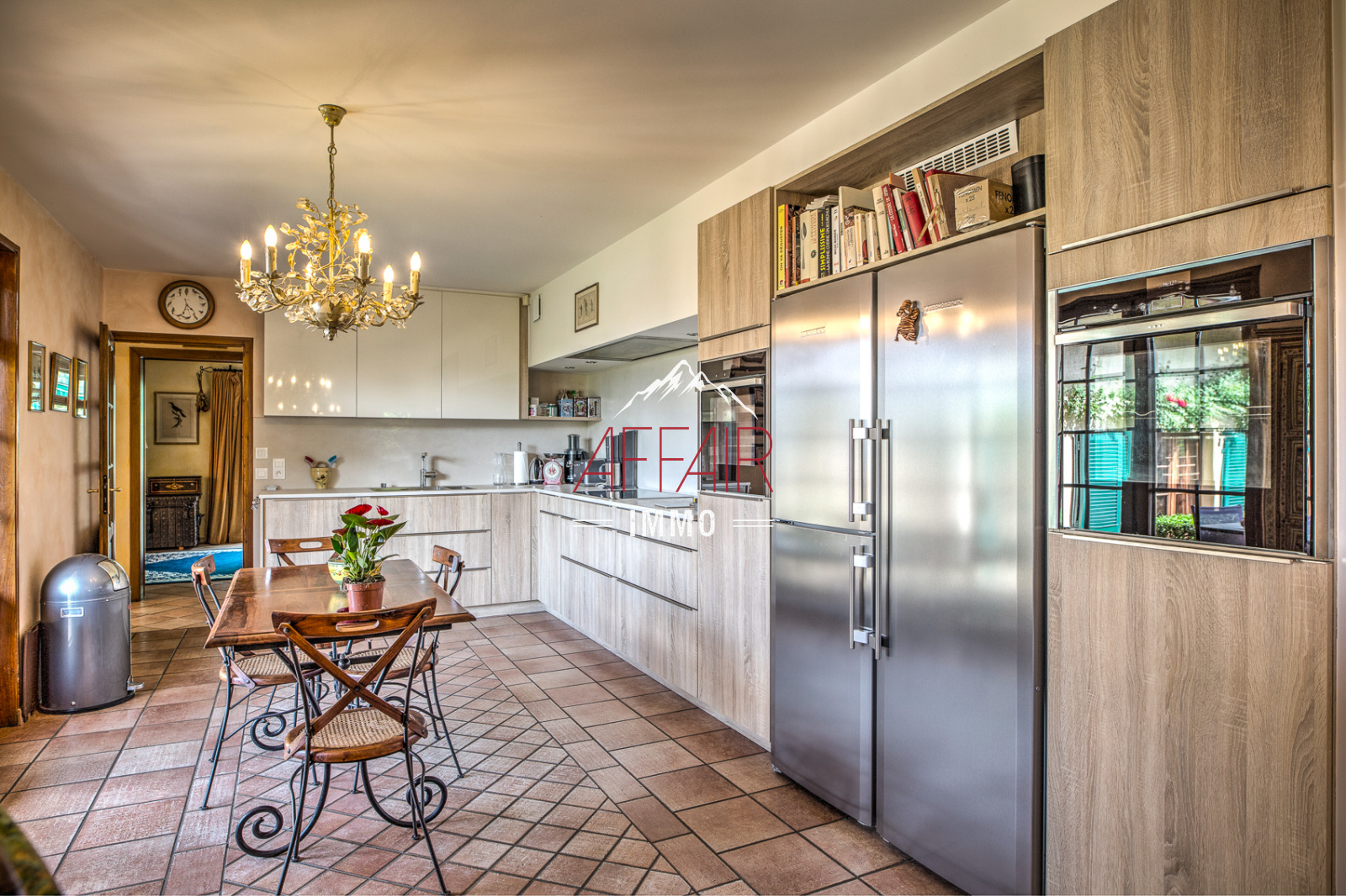 A 10 minutes de GENEVE, 15 minutes de l'aéroport - Au centre du village de Collonges-sous-Salève 74160, idéalement située à proximité des commerces, écoles et bus TPG, et à 2 minutes de la Douane de la Croix de Rozon, dans un environnement calme et privilégié offrant une vue dégagée sur le Jura, le Lac Léman et le Salève, maison individuelle de caractère et de qualité d'environ 380 m² implantée sur un terrain de 1650 m²entièrement arboré et clôturé. Elle nous offre au rez de chaussée une grande entrée avec son poêle Godin, une récente cuisine équipée ouverte sur la salle à manger, une double salle de séjour avec sa cheminée donnant accès à une spacieuse véranda chauffée baignée de lumière accueillant un jacuzzi et un hammam où vous pourrez profiter d'une agréable vue dégagée sur le Jura, le Lac Léman et le Salève. Une chambre avec mezzanine. Un wc indépendant et une buanderie. A l'étage une suite parentale avec placards, sa salle de bains avec double vasque, baignoire, douche et wc, une chambre avec sa salle de douche et wc, deux autres chambres, une salle de bains avec baignoire et douche, un wc indépendant. Nombreux rangements au sous-sol et une cave à vin. A l'extérieur, un chalet de jardin. Chauffage au gaz, au sol au rez. Terrain piscinable.
