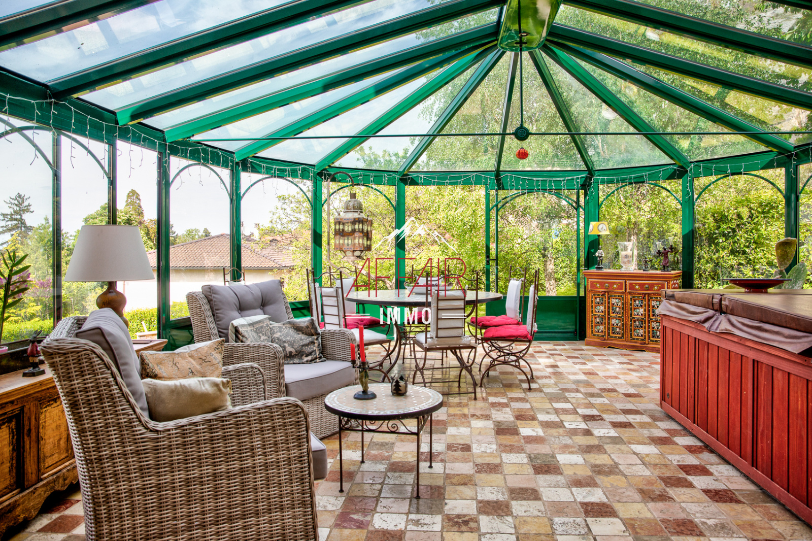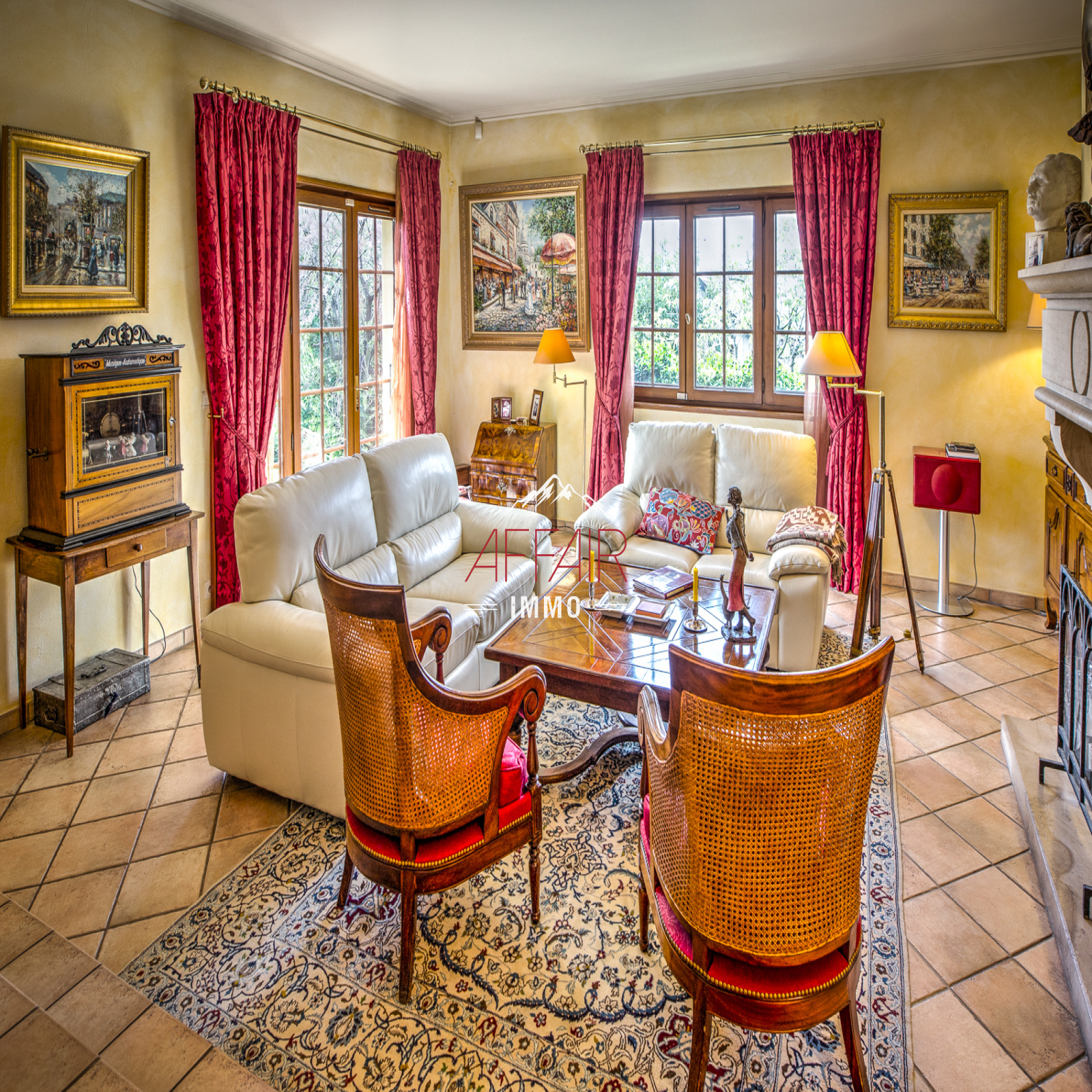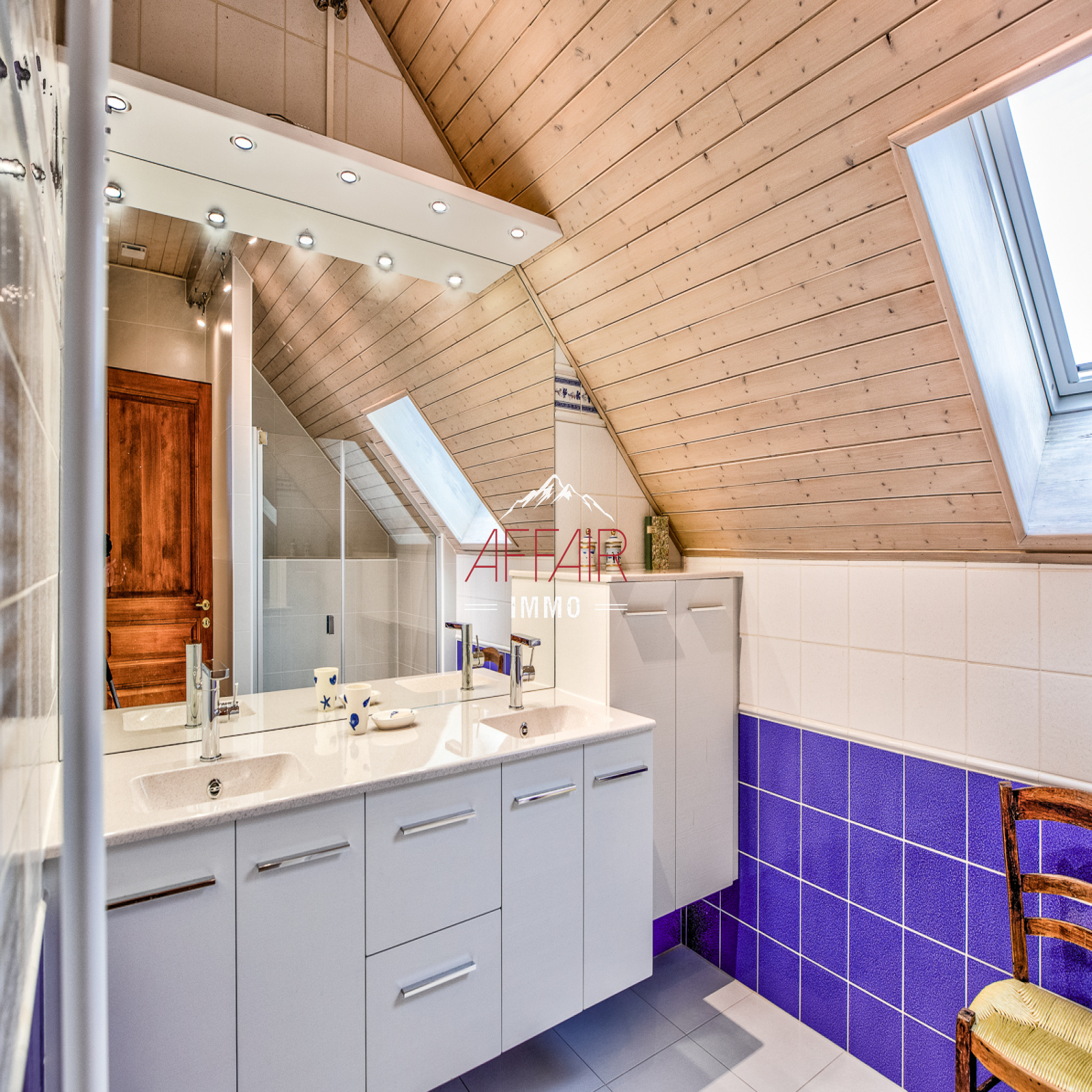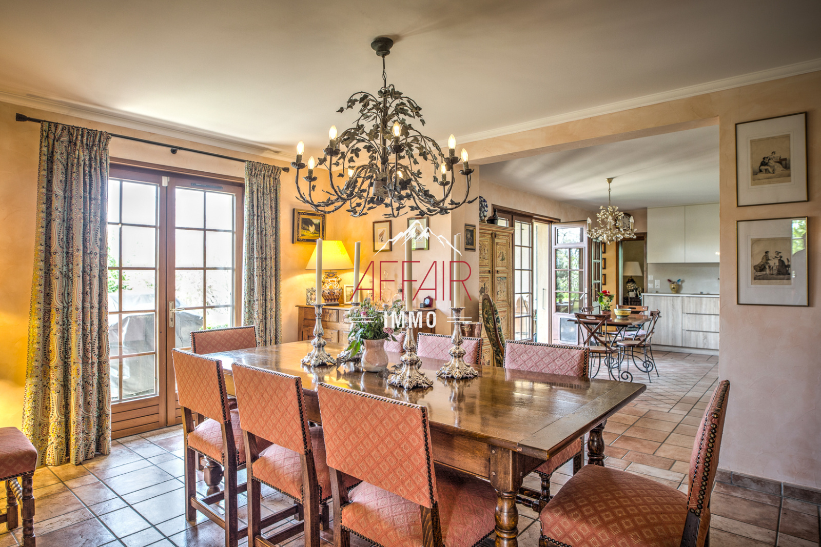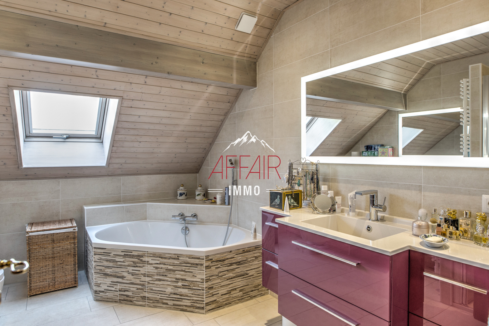 A 10 minutes de GENEVE, 15 minutes de l'aéroport - Au centre du village de Collonges-sous-Salève 74160, idéalement située à proximité des commerces, écoles et bus TPG, et à 2 minutes de la Douane de la Croix de Rozon, dans un environnement calme et privilégié offrant une vue dégagée sur le Jura, le Lac Léman et le Salève, maison individuelle de caractère et de qualité d'environ 380 m² implantée sur un terrain de 1650 m²entièrement arboré et clôturé. Elle nous offre au rez de chaussée une grande entrée avec son poêle Godin, une récente cuisine équipée ouverte sur la salle à manger, une double salle de séjour avec sa cheminée donnant accès à une spacieuse véranda chauffée baignée de lumière accueillant un jacuzzi et un hammam où vous pourrez profiter d'une agréable vue dégagée sur le Jura, le Lac Léman et le Salève. Une chambre avec mezzanine. Un wc indépendant et une buanderie. A l'étage une suite parentale avec placards, sa salle de bains avec double vasque, baignoire, douche et wc, une chambre avec sa salle de douche et wc, deux autres chambres, une salle de bains avec baignoire et douche, un wc indépendant. Nombreux rangements au sous-sol et une cave à vin. A l'extérieur, un chalet de jardin. Chauffage au gaz, au sol au rez. Terrain piscinable.