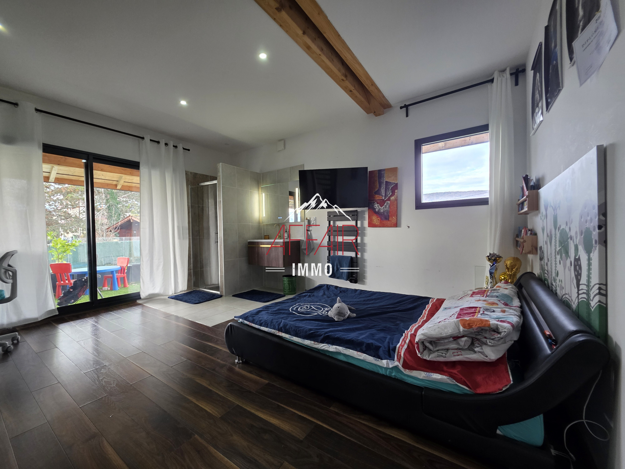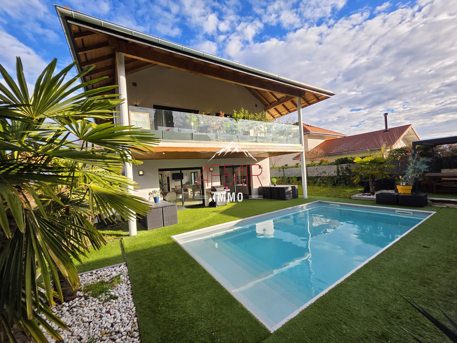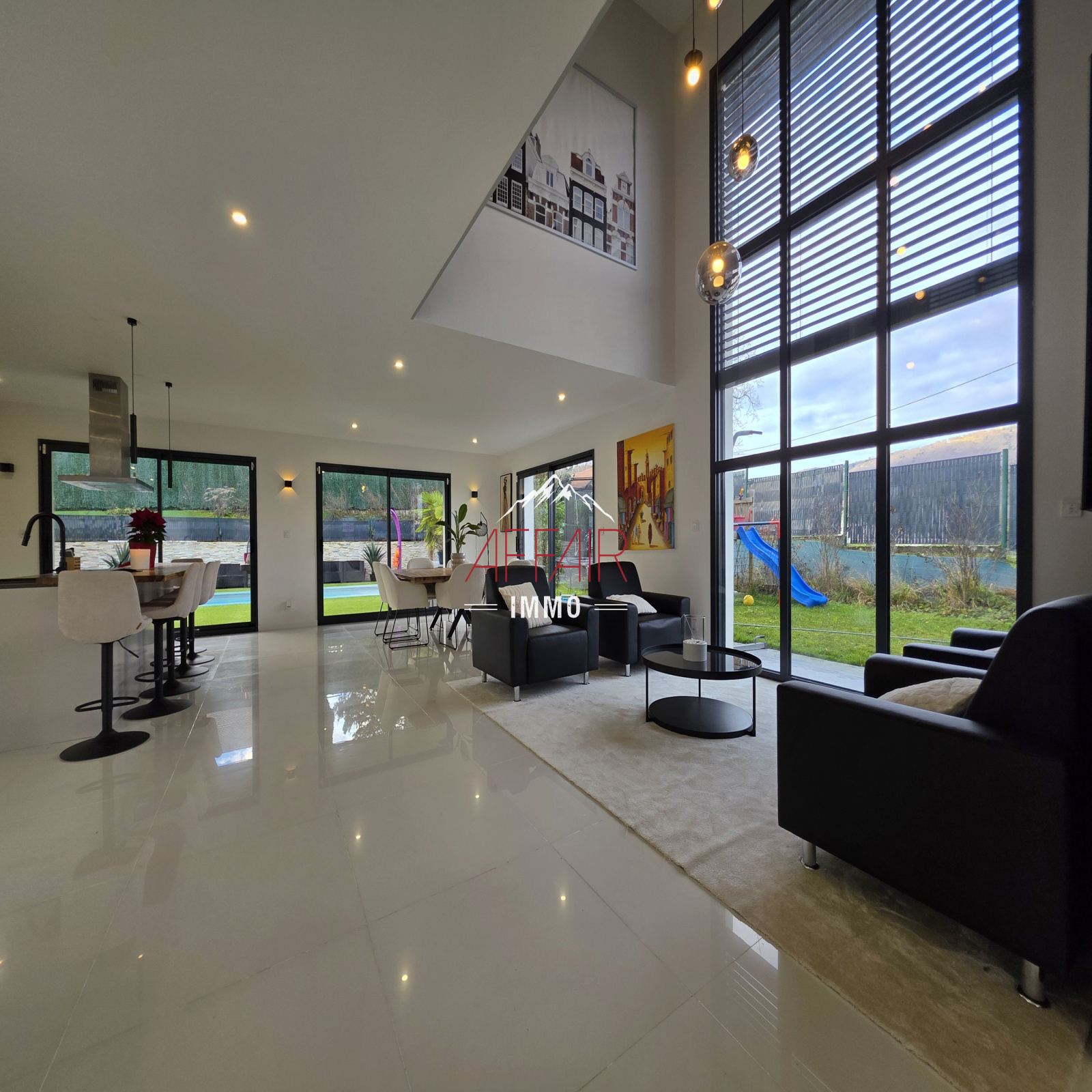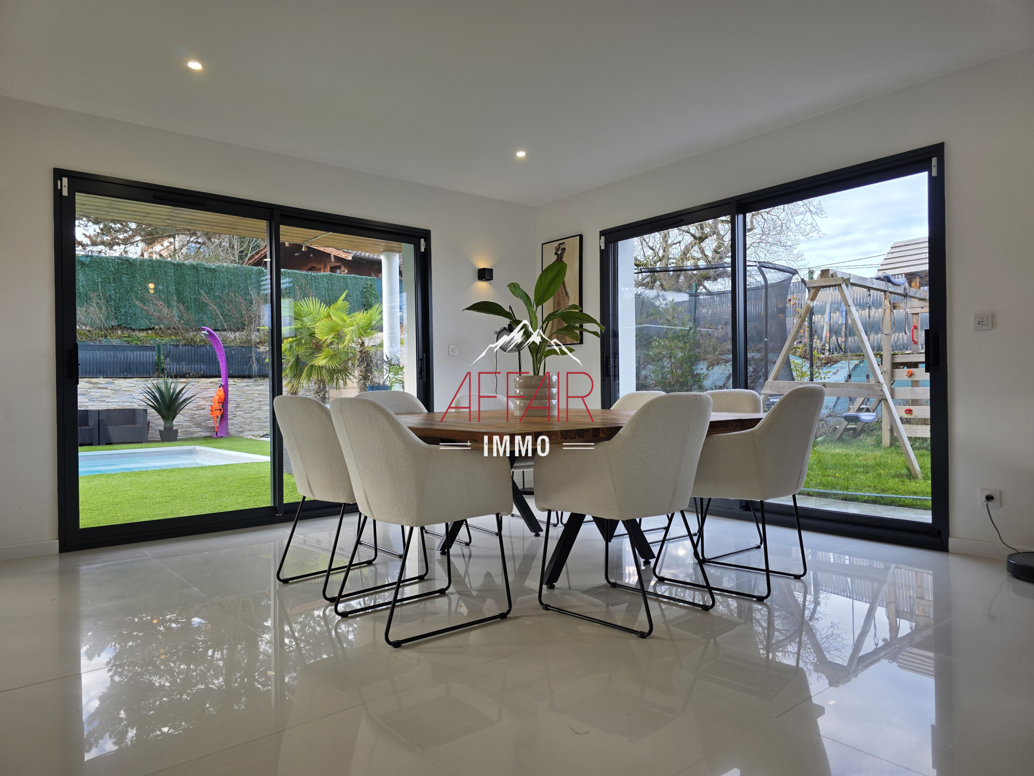 EN EXCLUSIVITE, A deux pas du Golf d'Esery, à 5 minutes de la gare (Léman Express) et à 35 minutes de Genève et aéroport de Genève. Maison d'architecte de 2018 d'environ 235 m² située dans un environnement calme et verdoyant, magnifique vue sur les montagnes, elle offre un espace de vie d'environ 92 m² baigné de lumière grâce à ses grandes ouvertures et son plafond cathédrale, qui réunit un double salon, une salle à manger et une cuisine équipée. La maison propose quatre chambres avec dressing et salle d'eau, dont une spacieuse suite parentale avec son dressing et sa salle de bains / douche. Un bureau. une buanderie. Le terrain clos et arboré accueille une piscine chauffée, une pergola, une terrasse couverte. Prestations de qualité : stores électriques, chauffage au sol par pompe à chaleur, portail motorisé, alarme, vidéoprotection. Une grande cour pouvant accueillir plusieurs véhicules. (Borne de recharge pour véhicules électriques). Abri jardin.