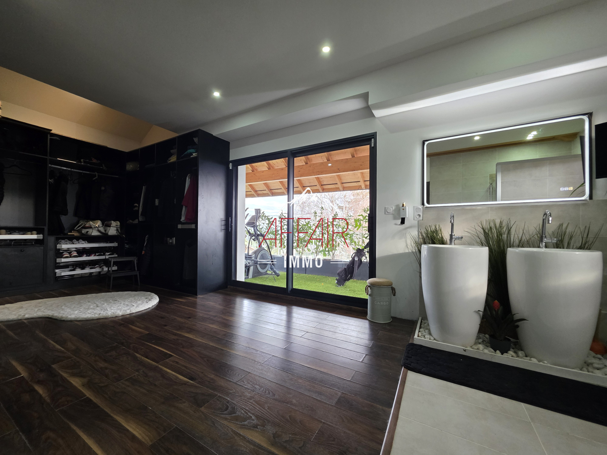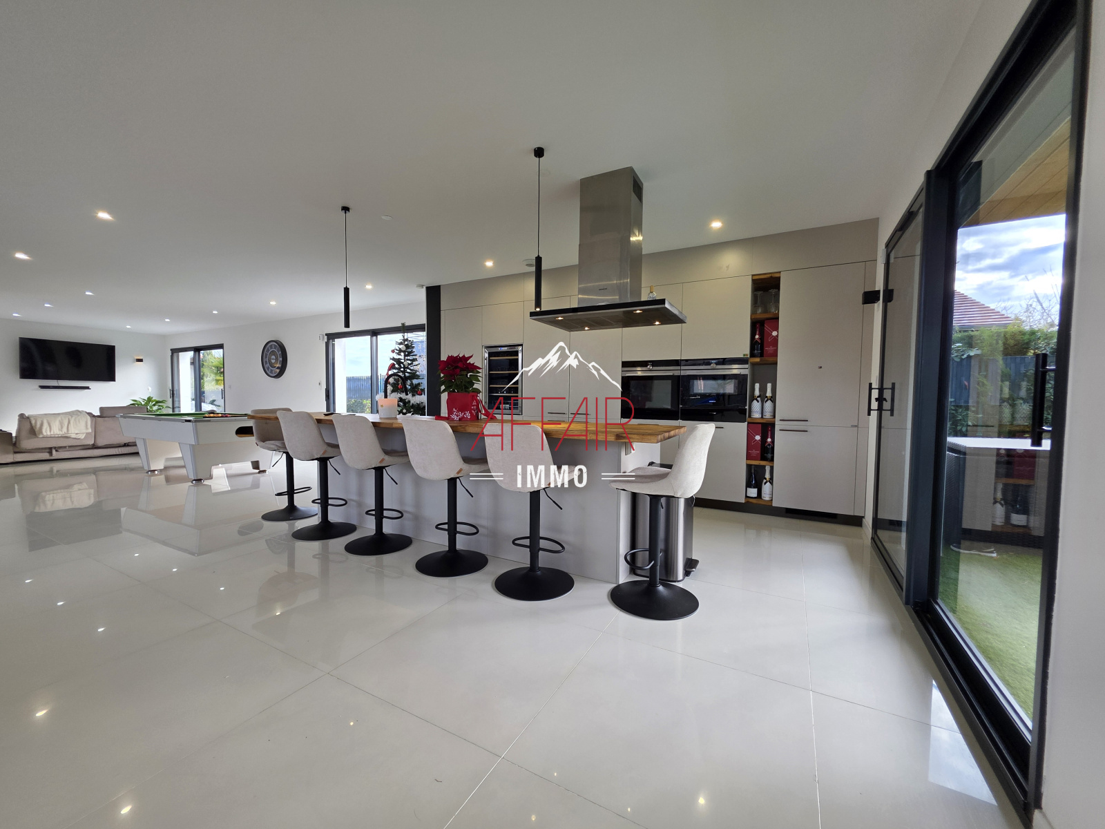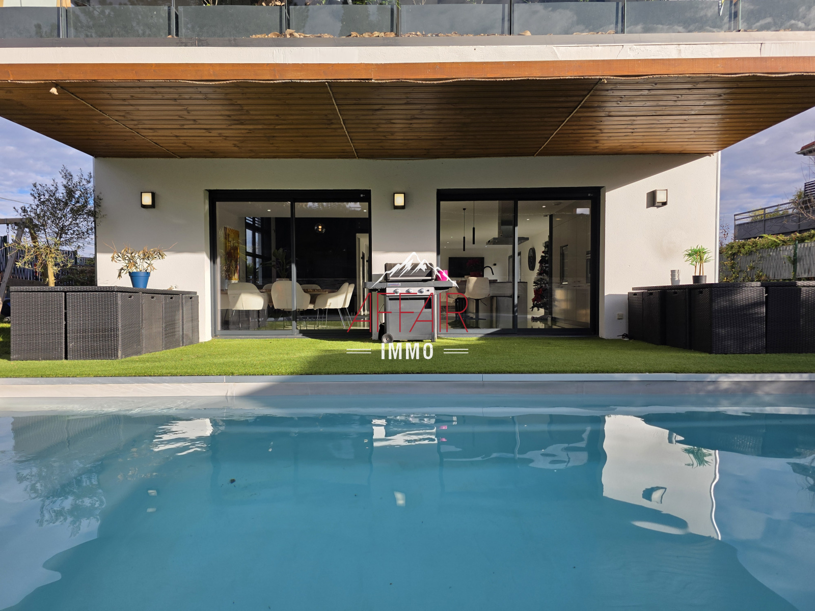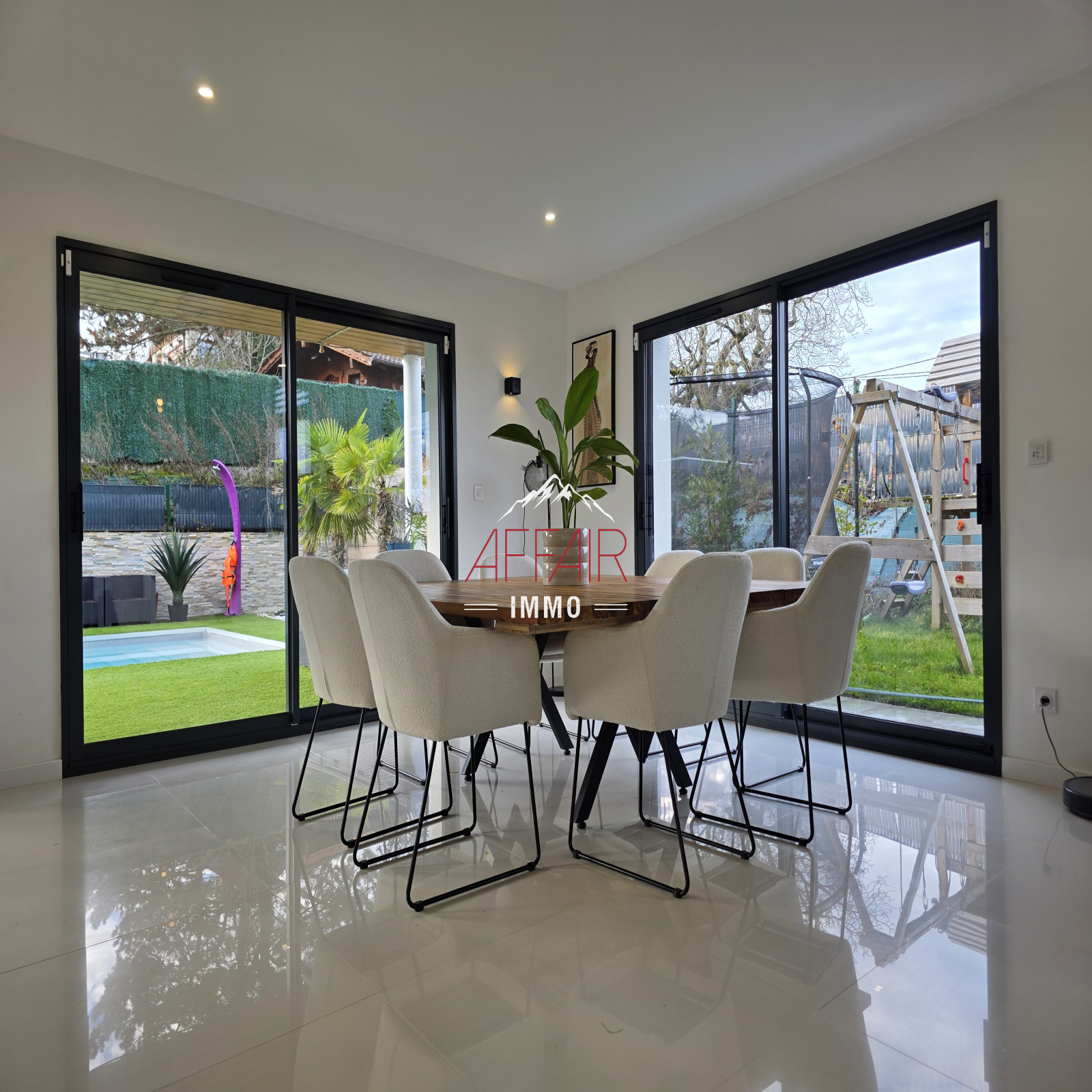 EN EXCLUSIVITE, A deux pas du Golf d'Esery, à 5 minutes de la gare (Léman Express) et à 35 minutes de Genève et aéroport de Genève. Maison d'architecte de 2018 d'environ 235 m² située dans un environnement calme et verdoyant, magnifique vue sur les montagnes, elle offre un espace de vie d'environ 92 m² baigné de lumière grâce à ses grandes ouvertures et son plafond cathédrale, qui réunit un double salon, une salle à manger et une cuisine équipée. La maison propose quatre chambres avec dressing et salle d'eau, dont une spacieuse suite parentale avec son dressing et sa salle de bains / douche. Un bureau. une buanderie. Le terrain clos et arboré accueille une piscine chauffée, une pergola, une terrasse couverte. Prestations de qualité : stores électriques, chauffage au sol par pompe à chaleur, portail motorisé, alarme, vidéoprotection. Une grande cour pouvant accueillir plusieurs véhicules. (Borne de recharge pour véhicules électriques). Abri jardin.